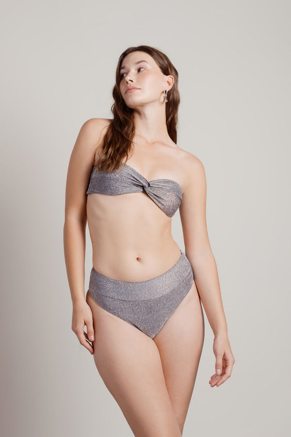 Dive into dazzling style with the Twist and Turn Metallic Bikini Set! This eye-catching set features a sleek metallic finish and a bandeau top with a playful front knot detail, adding a touch of glam to your beach or poolside look. Available in Silver, it's perfect for making waves and turning heads. Slip into this bikini and shine bright under the sun-your ultimate summer statement awaits!