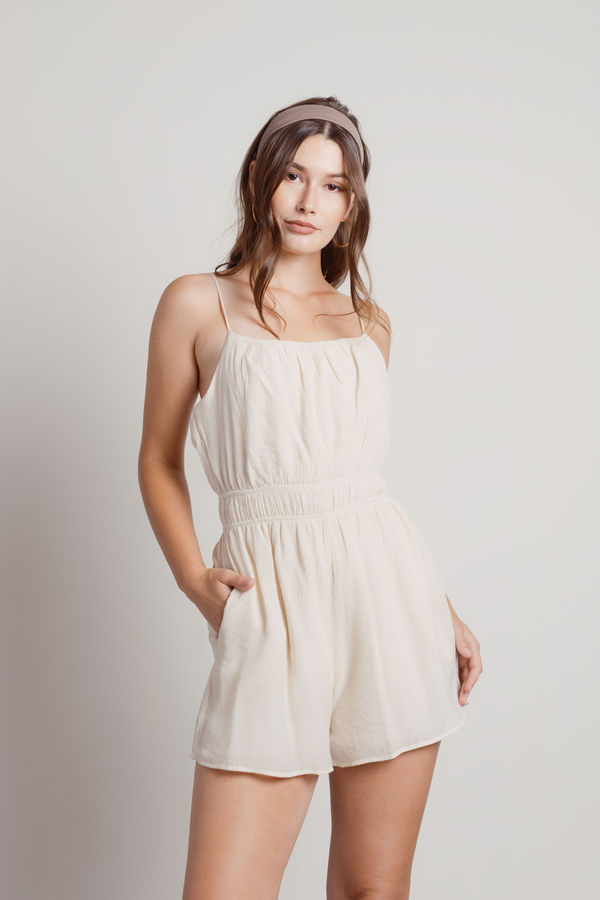 Lined in a breathable cotton, the beige hue of this romper goes with everything in your closet. The perfect effortless outfit for warm summer days. Whether you pair it with sandals, sneakers, or wedges, this romper is cool and feminine.