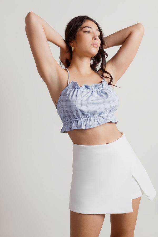 Live your cottagecore dreams in the Get A Clue Crop Top in Blue! This blue plaid crop top features a ruffled and ruched hem with cross-back straps for a charming, feminine look. Perfect for pairing with the Get A Clue Plaid Elastic Waist Straight Leg Pants, this adorable set will have you embracing a cute cottagecore aesthetic that's perfect for casual outings or cozy picnics.