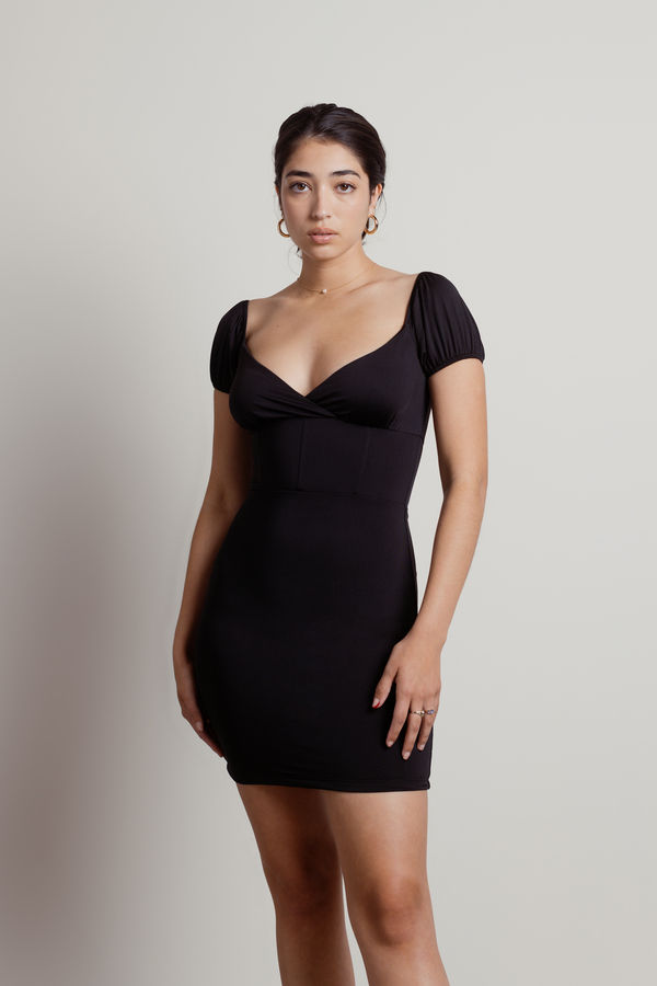 Keep it simple in the Myra Off Shoulder Bodycon Mini Dress. This little black dress is your secret style tool for any occasion. This black mini dress features short sleeve, a wide v-neckline and a hidden back zipper. Pair this dress with black high heels. Accessorize with chain jewelry.