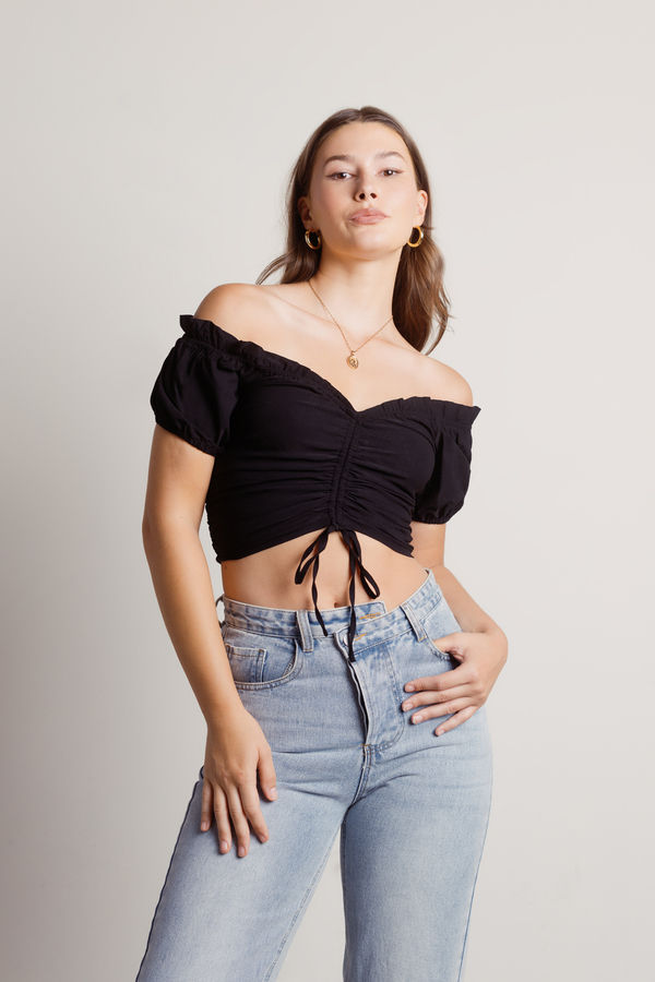 Show a little skin and a lot of style in the Margaret Crop Top in Black! Featuring a flattering V-neckline, short sleeves, and ruched front tie details, this crop top is perfect for turning heads. Pair it with high-waisted jeans and heels for a romantic date, brunch, or concert. Effortlessly chic and undeniably feminine, it's the perfect piece for any occasion.