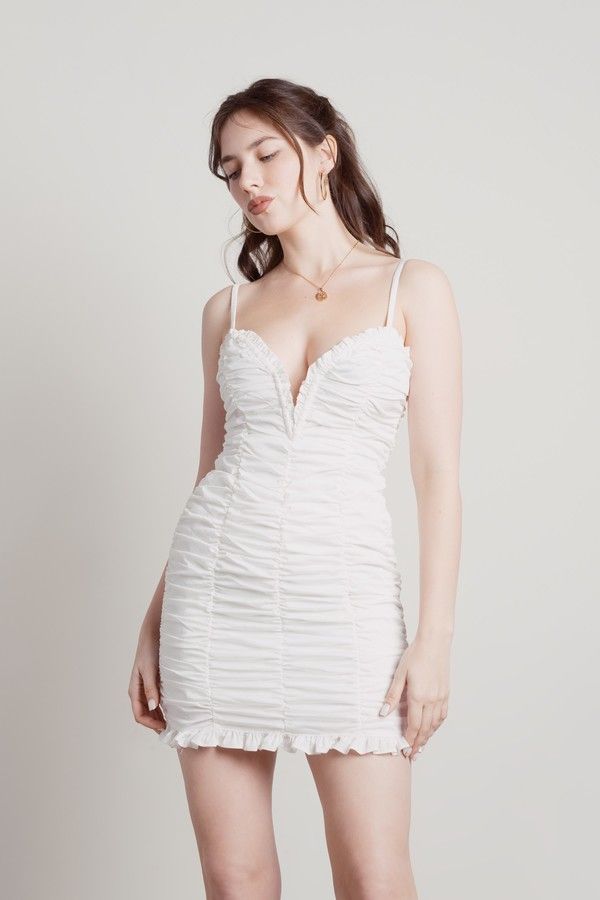 The Janette Deep V Ruffled Ruched Bodycon Dress is the perfect little white dress for summer. This white mini dress features a ruched body, ruffled trim, and a V-wired neckline. Pair this dress with strappy heeled sandals. Accessorize with a light chain necklace.