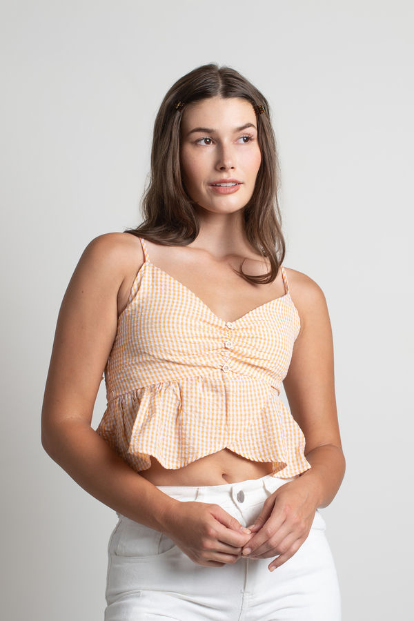 Channel your cottagecore dreams with the Sweet Citrus Crop Top in Orange! Designed with adjustable tie straps, a smocked back for the perfect fit, and a charming ruffled hem, this top is as dreamy as a sunny picnic. The floral-shaped buttons add a delightful finishing touch, making it your new go-to for effortless charm.