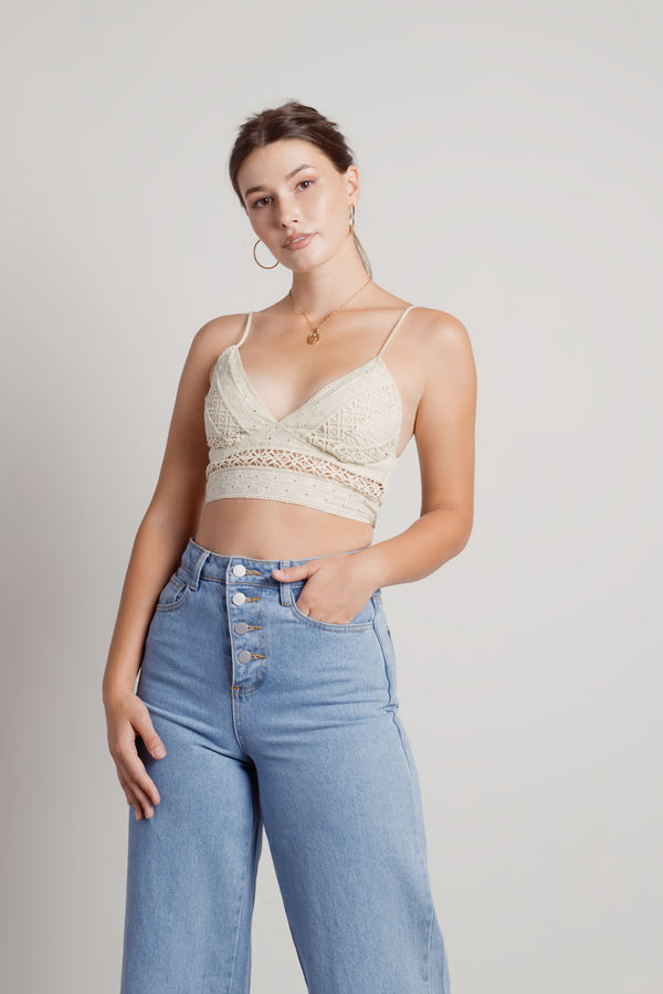 Turn heads in the Catch My Thoughts Ivory Embroidered Crochet Bralette. This boho crochet bralette features a smocked back with crochet detailing. Pair this with high waisted denim shorts for a cute festival look.