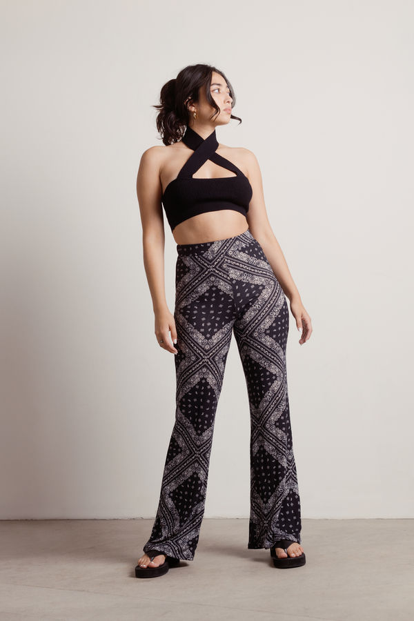 Wear The Kash Black Bandana Straight Leg Knit Pants as you dance the night away. These pants feature a paisley print, elastic waistband, and a flare leg to create a retro 70s look. Complete the look with a basic halter top for a trendy festival look.