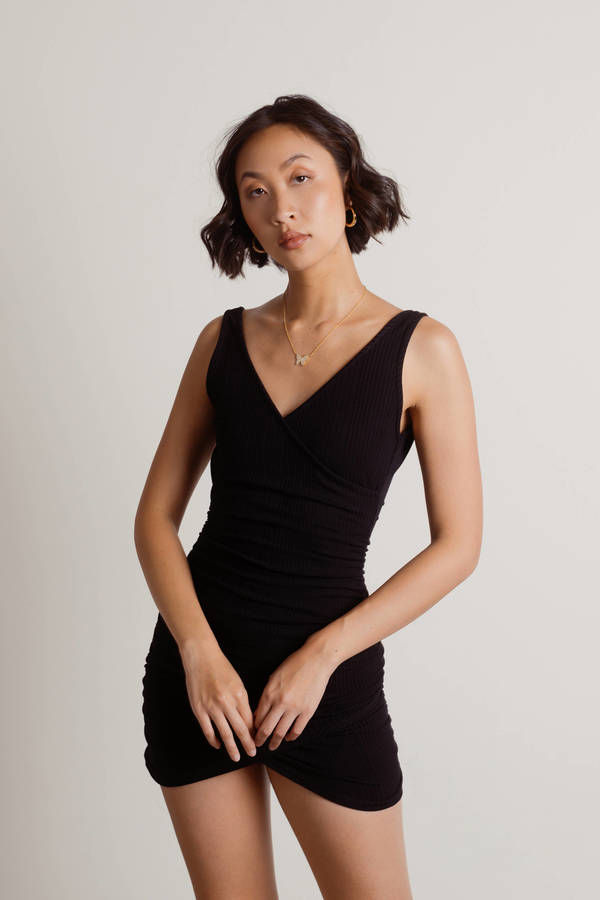 Make the Bea Black Ribbed Surplice Ruched Bodycon Mini Dress your go-to black dress for every occasion! Featuring a deep V-neckline and surplice bodice, it’s perfect for showing a little skin. The ruched detailing adds a hint of casual charm, making it easy to dress up or down. Whether for a concert, a date, or anything in between, this versatile mini is your new favorite.