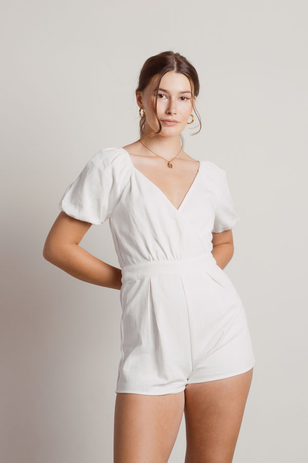 Wear the More On That Off White Puff Sleeve Romper for an effortless look. This all-in-one outfit features short sleeves, a v-neckline, a back zipper closure, and an adjustable black tie closure. Complete the look with flatform sandals for a summery look for brunch dates or vacation.