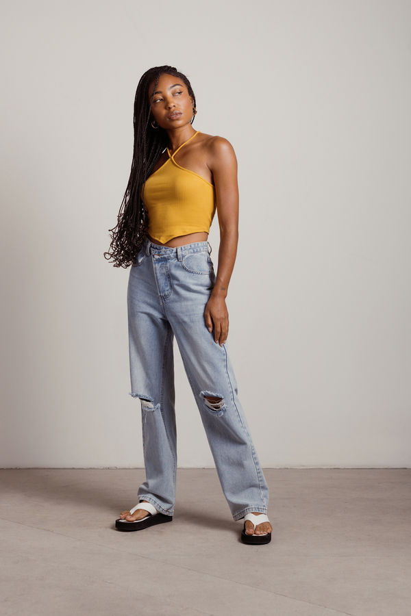Rock the eternal cool girl look with the Always and Forever Crop Top in Yellow. Featuring a ribbed texture, asymmetrical handkerchief hem, and halter neckline, this top brings bold style to your wardrobe. Pair it with flared bell-bottom jeans for that perfect 70s aesthetic, or accessorize to make this chic, fun piece your new go-to for effortless fashion that’s always on trend.