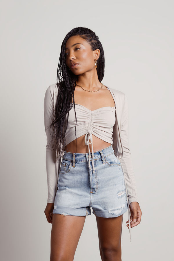 Get summer-ready with the Mina Crop Top and Cardigan Set in Taupe. This two-piece set features a flirty ruched tie-front crop top and a matching shrug for a look that's both chic and comfortable. Pair it with a mini skirt, heeled sandals, and your favorite jewelry for a casual-cute outfit that’s perfect for sunny days and warm evenings. Effortless style, all in one set!