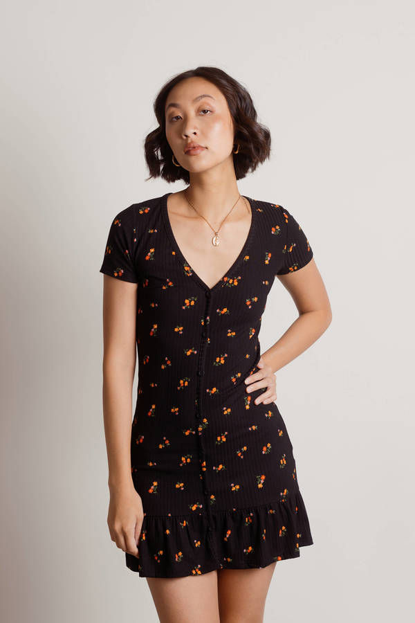 Discover the Two Fold Floral Ribbed Button Bodycon Mini Dress in Black Featuring a front button closure, ruffled bottom, and ribbed material, this bodycon dress is a must-have. Complete the look with heels and gold statement earrings for a chic brunch outfit.