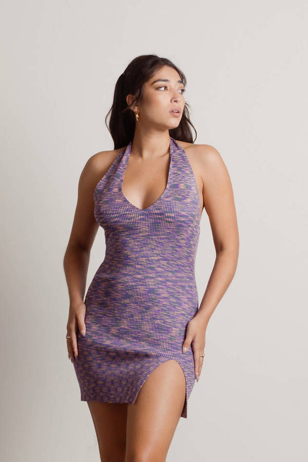 Lookin ethereal in Space Babe Halter Sweater Knit Bodycon Dress in Purple is out of this world! This glitchy knit dress features a halter neckline with adjustable straps, warm knit material, and a side slit. Accessorize this bodycon dress with a beaded pearl choker and white cowboy boots for a trendy festival look that's sweat and dance-proof.