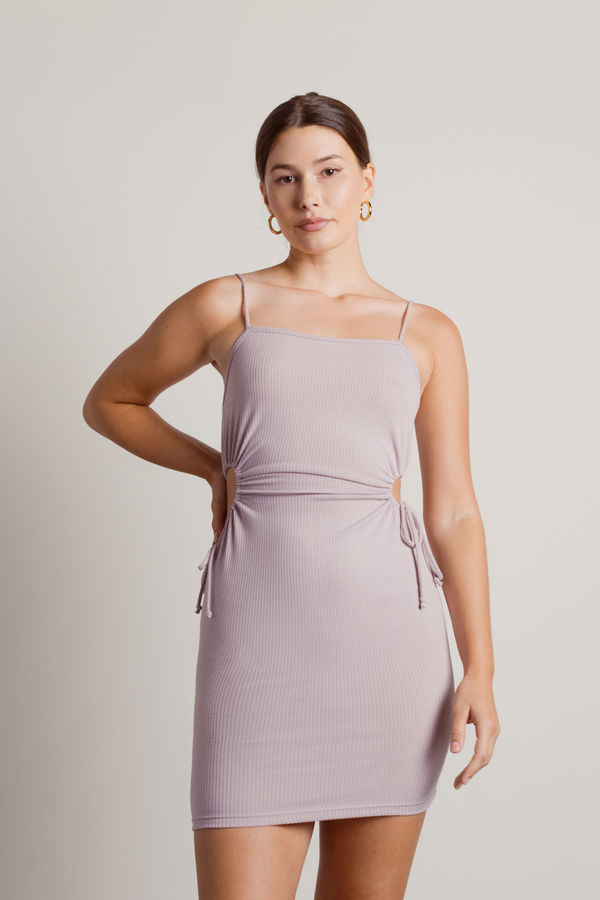 Have a peek-a-boo moment in the Salazar Ribbed Side Cutout Bodycon Mini Dress in Lilac. This mini dress features adjustable side ruched tie details, a square neckline, and ribbed material. Bonus: this bodycon dress has side cutouts.
