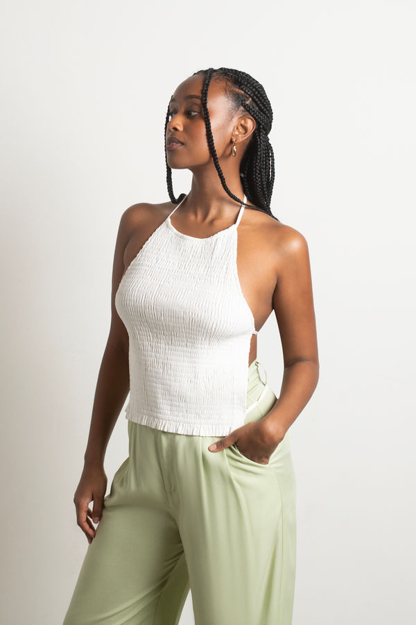 Embrace effortless style with the Curtis Crop Top in Ivory! This summer must-have features a smocked body, adjustable halter tie, and a double back tie closure for a perfect fit. Pair it with high-waisted shorts and sandals for a boho chic vibe that’s perfect for the beach, vacation, or a casual day running errands. Your new go-to top for laid-back, sunny days!