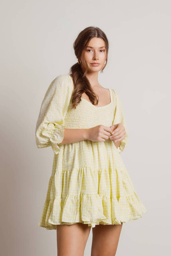 Bask in the Afternoon Sun Lime Gingham Smocked Babydoll Dress in Lime all spring and summer long. This babydoll dress features a smocked bust, tiered skirt, and half sleeves with ruffled cuffs. Grab your picnic blanket and art supplies and have a painting date with your best friends or significant other.