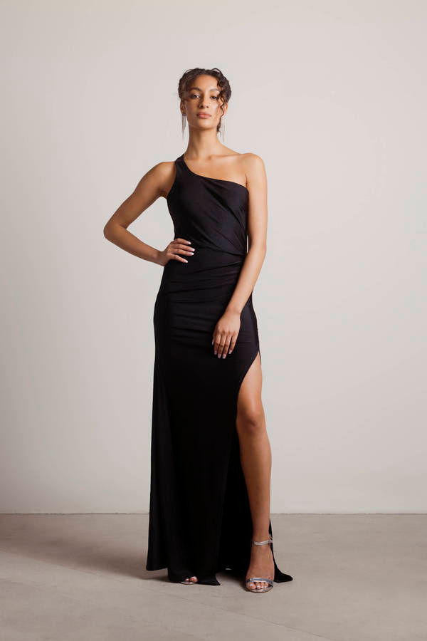Fall into the lap of luxury in the Nights Like This One Shoulder Slit Maxi Dress in Black. This formal maxi dress features one shoulder and a high side slit. Accessorize the look with gold hoops and high heels to create a chic elegant outfit to wear for a formal occasion such as your bestie's wedding or your prom night.