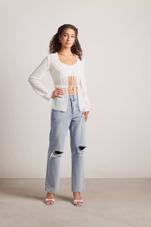 Step out in style with our Take Me Out Open Front Blouse in White! Featuring two front ties and exposed stitching, this blouse offers a trendy, edgy look. The ruffled trim adds a fun, flirty detail, while the semi-sheer fabric brings a touch of sophistication. Whether you're heading to a lively event or just want to jazz up your everyday wear, this blouse combines creativity and charm to make a statement. Embrace the fun and turn heads with every move!