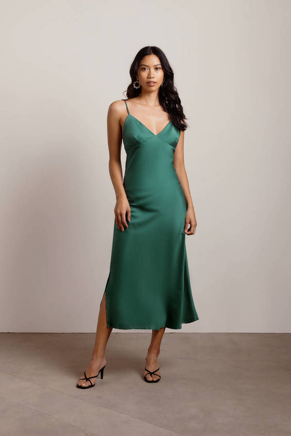 Slip into the Show Up Satin Midi Dress and be the best-dressed guest. This Green satin dress offers adjustable spaghetti straps and a side slit. Complete your wedding guest outfit with drop earrings and strappy heels for a modern, romantic look.