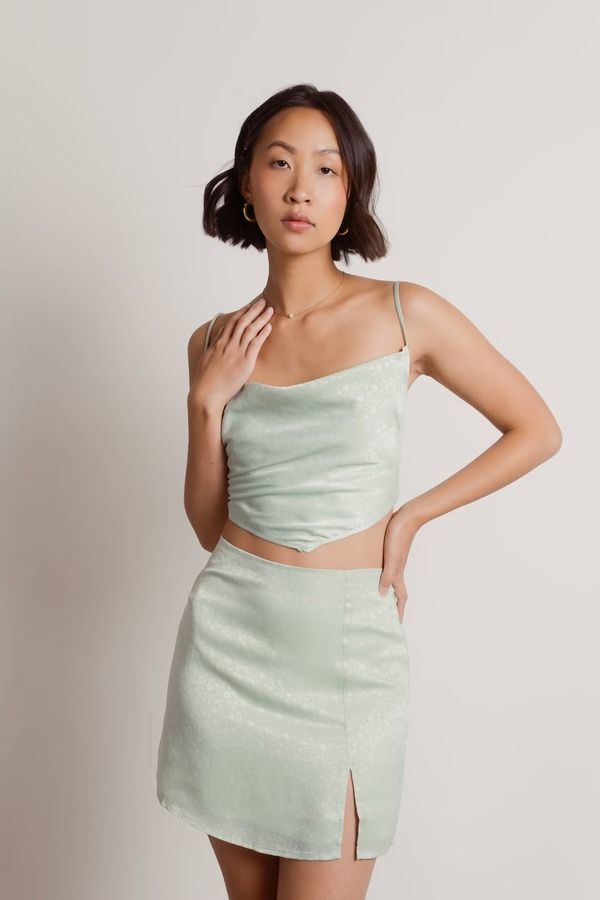 The Is It Over Sage Ditsy Floral Slit Mini Skirt pairs with the Is It Over Ditsy Floral Cowl Neck Scarf Crop Top. This mini skirt features a high waist and satin material. Pair with heels for a chic look to wear for a date or girls night out.