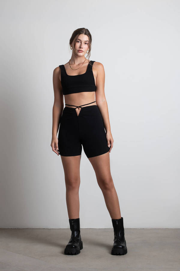 Get sporty chic with the Charm & Charisma Black Waist Ties Biker Shorts. These biker shorts feature a front v-wire, ribbed material, and an adjustable waist tie. Dress it up with a basic black crop top and black combat boots for a monochromatic streetwear look, or wear with tennis shoes to make it look like you just came from the gym while paying for your green juice.