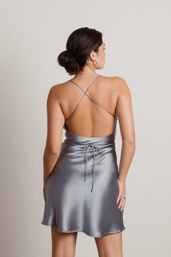Description Shine in the Light Up The Night Grey Sage Satin Cowl Neck Mini Dress in Grey. This satin dress features halter neck ties, adjustable wrap ties, and a cowl neckline. Complete the look with strappy heels and gold hoops for a chic outfit to wear for parties, homecoming, or weddings..