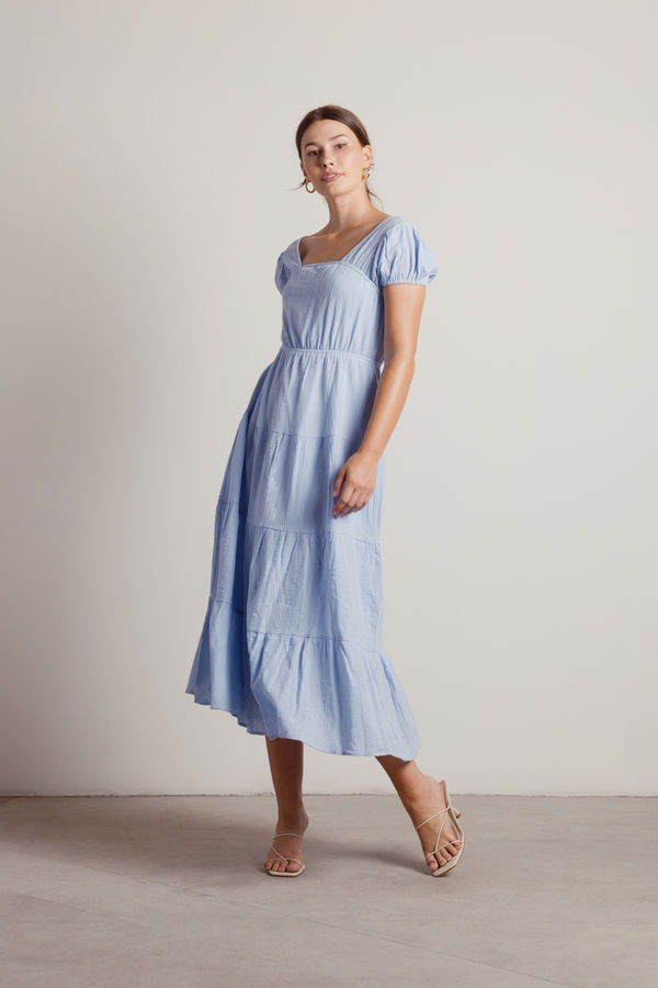 Feel effortlessly chic in the Misty Textured Cotton Tiered Midi Dress in Blue! This breezy dress features soft, textured cotton and a flattering tiered design that flows beautifully with every step. Perfect for warm days, its lightweight fabric keeps you cool and stylish whether you're at brunch or strolling through the park. The relaxed fit and midi length strike the perfect balance between comfort and elegance. Pair it with sandals and a sunhat for the ultimate carefree,sunnyday look!