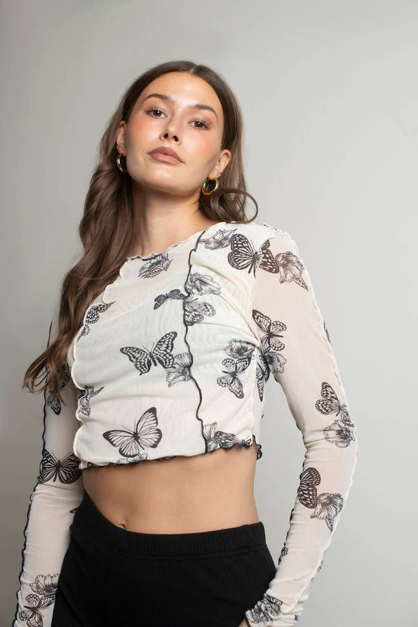 The Collector Sheer Butterfly Mesh Top in Cream is reminiscent of the early 2000s fashion. This crop top features long sleeves, exposed stitches, and mesh material. Pair this top with flare pants and high heeled boots for a chic Y2K inspired look.