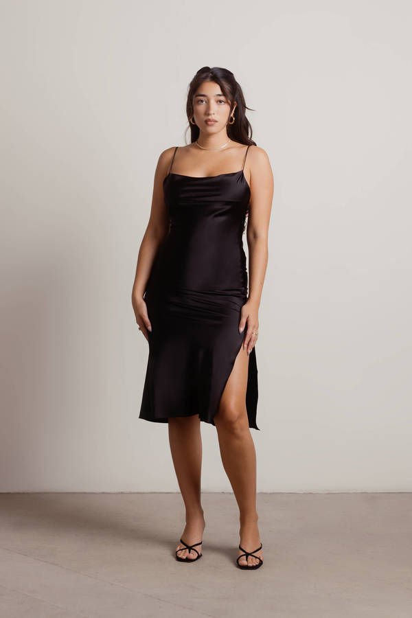 Slay the night in the On A Mission Satin Cowl Neck Slit Midi Dress in Black! This stunning midi dress combines luxurious satin fabric with a sultry cowl neck design, ensuring you look effortlessly elegant.The daring slit adds a touch of drama, making it perfect for date nights, parties, or any event where you want to make an unforgettable impression. Slip it on with your favorite heels, and get ready to steal the spotlight wherever you go!
