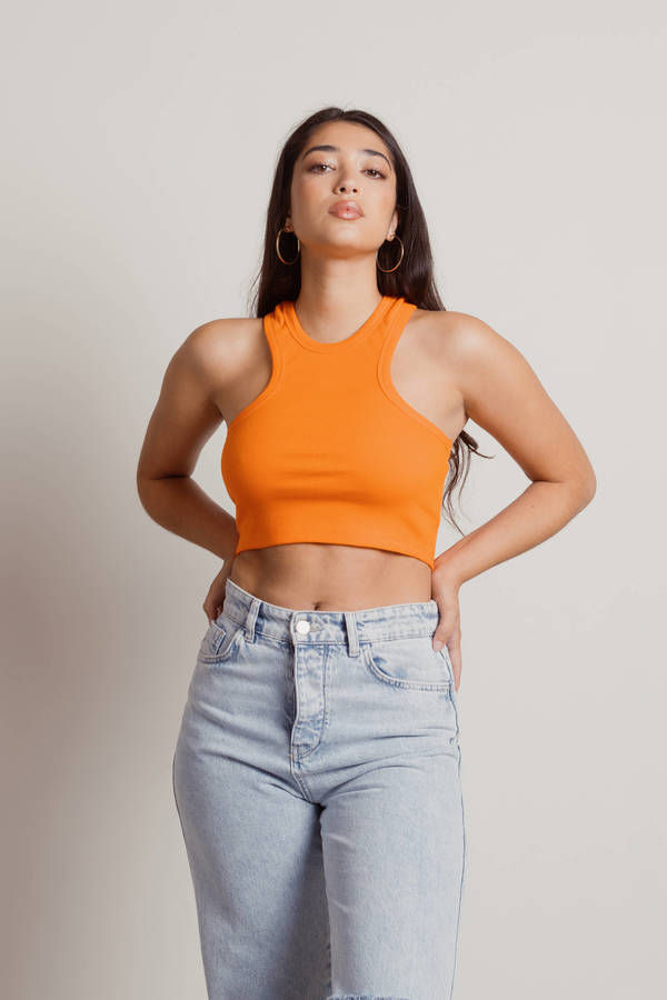 Get a sporty casual look with the Fernandez Ribbed Halter Crop Top in Orange. This tank crop features ribbed and cotton material and a slim fit. Pair this top with high waisted denim and sneakers for a chic streetwear look.