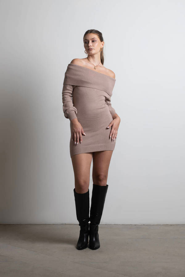 Turn up the heat with the Allyson Off The Shoulder Sweater Bodycon Dress in Beige! This body-hugging sweater dress combines the perfect mix of cozy and sultry with its off-the-shoulder neckline and flattering bodycon fit. The soft, stretchy knit fabric keeps you warm while showing off your curves, making it a must-have for chilly date nights or cozy gatherings. Pair with boots or heels, and get ready to steal the spotlight in this effortlessly chic and sexy sweater dress!
