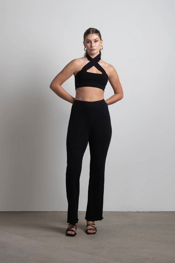 Add some flair to your 'fit with the Lucina Ribbed Flare Pants. These Black flare pants feature a lettuce hem, a stretchy elastic waistband, and ribbed material for a comfy fit. Pair with a halter top and heels for a '70s inspired look that can be worn for brunch, the club, or on a date.