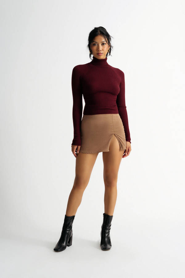 Looking for a chic turtleneck to for cold days? The Stick Around Turtle Neck Ribbed Sweater is here! This Dark Red turtleneck sweater features warm, stretchy ribbed material. This pairs perfectly with statement pants or a mini skirt for a casual yet chic office-to-concert look!