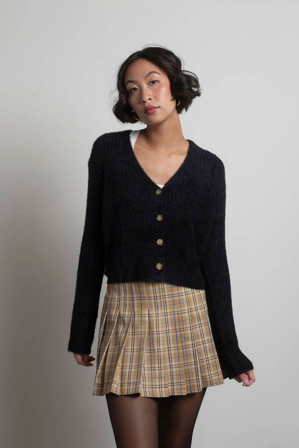 The Pieper Black Fuzzy Sweater Cardigan is a fall wardrobe essential you need. This slouchy cropped cardigan features a v-neckline, four-button closure, and warm fuzzy knit material. Pair with a mini skirt and tights for a soft grunge aesthetic for the cold months.