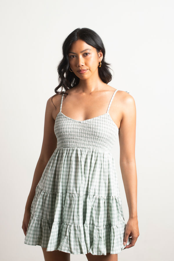 The Carried Away Sage Gingham Tiered Babydoll Mini Dress is the perfect little sundress for hot summer days. This adorable babydoll mini dress is just what you need to feel carefree and comfortable all season long. With a smocked bodice and tiered skirt, it has a touch of cottagecore charm. Whether you're headed to the beach or just spending a day in the park, this dress is sure to keep you cool and stylish.