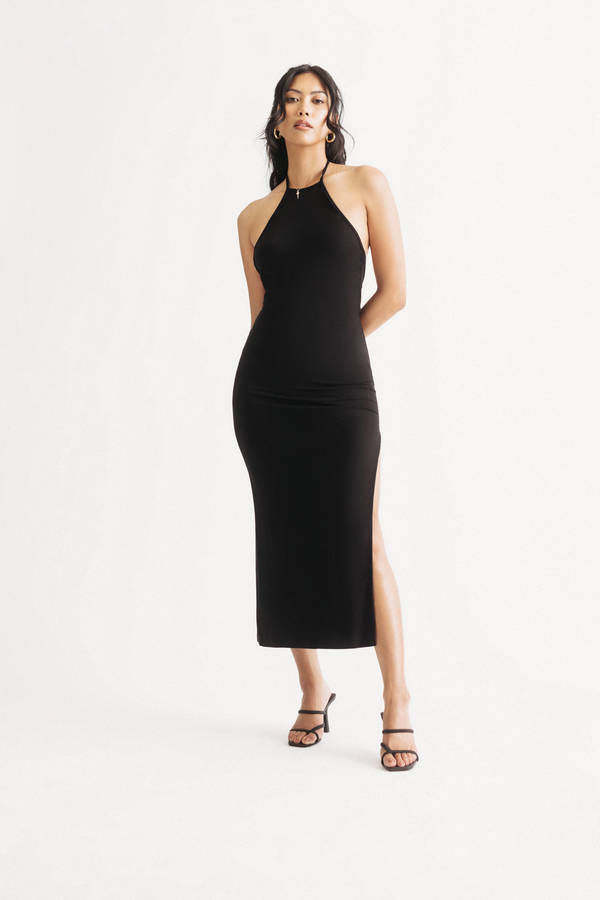 Turn heads and make a statement in the Alani Backless High Slit Midi Dress in Black! This stunning piece features a sleek halter neckline that beautifully frames your shoulders, while the daring open back adds a bold touch of allure. With a show-stopping thigh-high slit, this dress combines elegance with a touch of fun. Pair it with your favorite heels and statement jewelry, and get ready to steal the spotlight wherever you go!