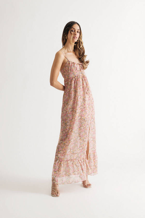 The Take It All Floral Slit Maxi Dress was made for days when you feel like taking on the world-and looking good doing it. With its maxi length, smocked back, and high side slit, this dress is sure to turn heads. The front button and tie closure, adjustable spaghetti straps, and floral print make this dress perfect for a day of exploring or a night on the town.