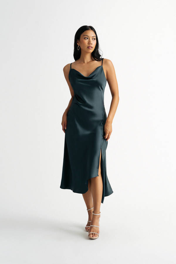 Looking for the perfect dress to wear out on a romantic date? Look no further than this So In Love Teal Satin Asymmetrical Slip Midi Dress. The slinky satin fabric and asymmetrical silhouette is sure to turn heads, while the cowl neck and spaghetti straps add a touch of elegance. The slit up the side gives this dress a sexy edge, while the midi length keeps it classy. Whether you're headed out for a night on the town or a dinner date, this asymmetric dress is sure to impress.