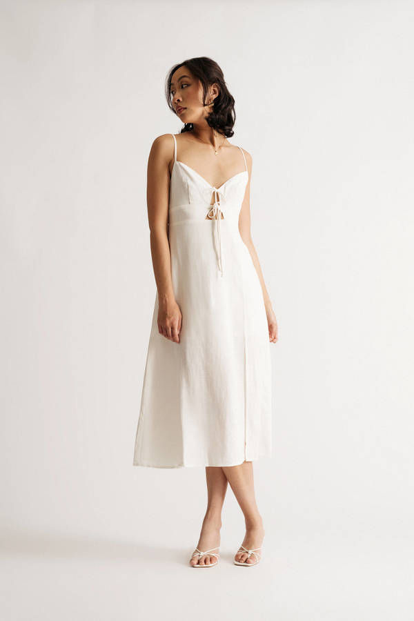 Looking for the perfect summer dress? Say hello to your new go-to: the Rosalie Linen Front Tie Midi Dress. Made from a flowy linen fabric, this dress is perfect for those hot summer days. It features a v neckline, front cutout, and cami straps for a feminine touch. The high side slit and front ties add a touch of sass, making this linen midi dress perfect for any occasion.