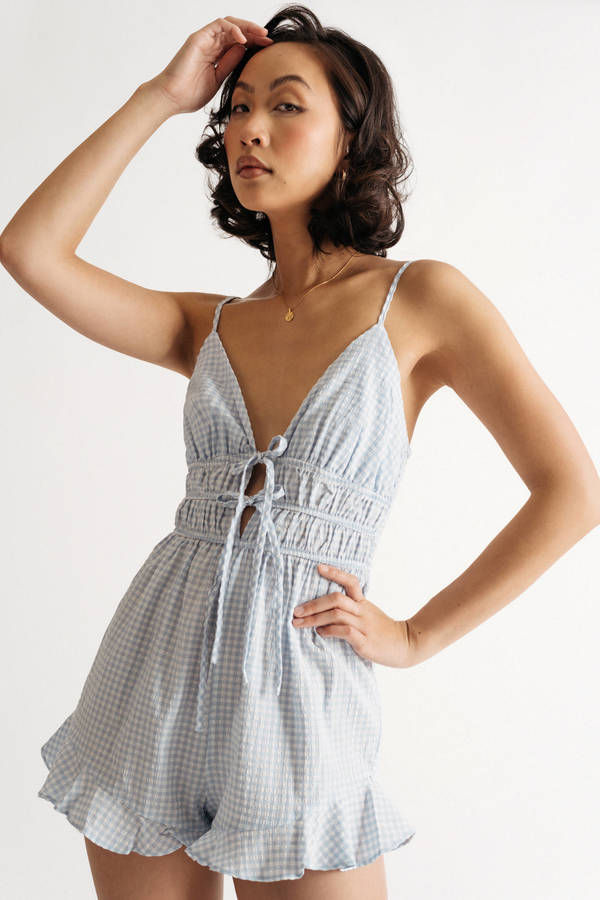 The Always A Dream Gingham Smocked Romper is a perfect outfit for any summer soiree! This sweet gingham print romper is perfect for any summer soiree. With smocked back details and front cutout tie details, this smocked romper is sure to make a statement. The textured fabric gives this gingham romper a unique look, while the front ties add a touch of femininity.