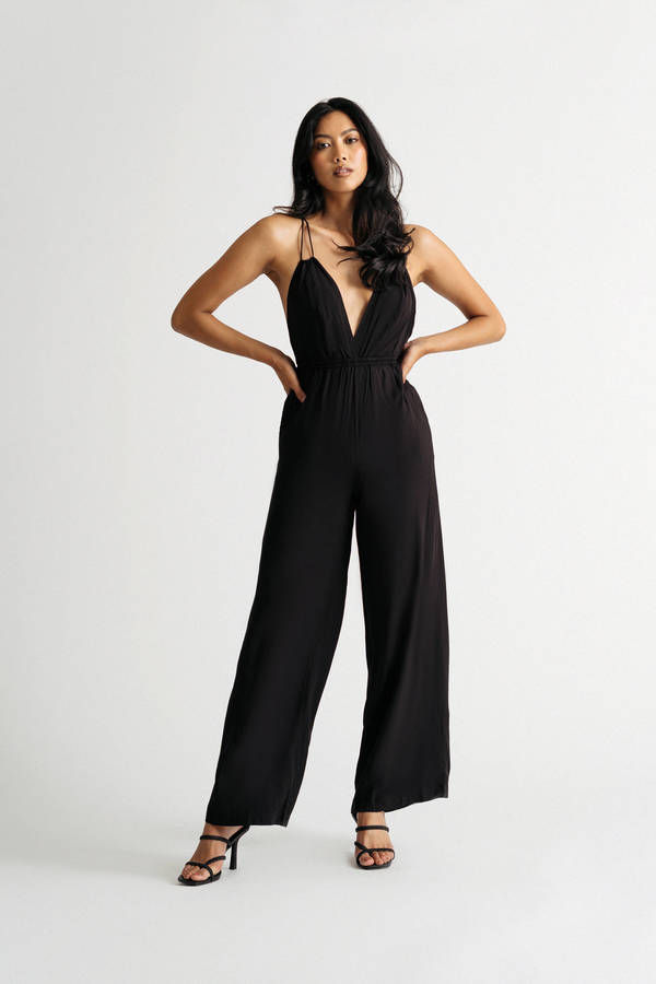 Dressed up or down, the Just Tonight Black Cross Back Straight Leg Jumpsuit is versatile for any night out. With a flowy silhouette and deep v neckline, this one-piece is sure to turn heads. Plus, the cami straps make it easy to dress up or down for any occasion. Whether you're hitting the town or going out on a romantic date, this jumpsuit will have you looking your best.
