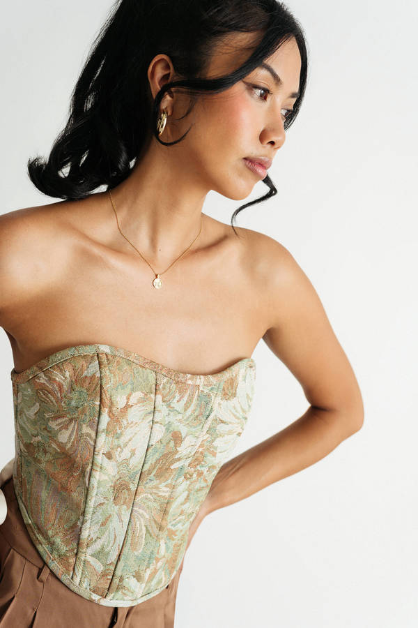 The Florencia Sage Multi Floral Lace-Up Corset Bustier Top is the perfect way to add a little something extra to your look. This corset-style top is strapless and sleeveless with a lace-up front. The best part? It's covered in a gorgeous floral print. Whether you're going for a night out or a day at the office, this bustier corset top is sure to turn heads.