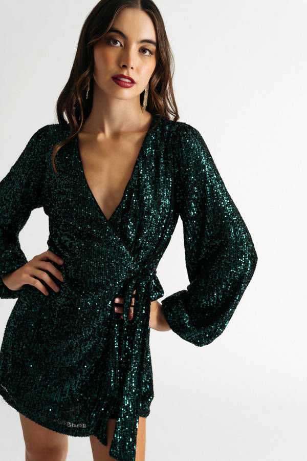 Add a little sparkle to your life with the Trisha Hunter Green Sequin Long Sleeve Wrap Mini Dress. This show-stopping mini dress features long loose sleeves, a deep v-neckline and all-over sequin detailing. The tie waist ensures a flattering and comfortable fit, while the mini length makes this dress perfect for a night out on the town. Whether you're headed to a holiday party or a night out with the girls, this mini long sleeve dress is sure to turn heads.