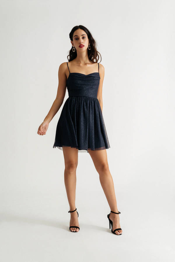 Make a statement in the Chatting You Up Glitter Skater Mini Dress in Navy. With an alluring cowl neckline, spaghetti straps, and a backless design, this mini dress is perfect for your next big night out. The flirty pleated skirt and fitted silhouette will keep you feeling confident and looking fabulous all night long. So go ahead, sparkle and shine. You deserve it!