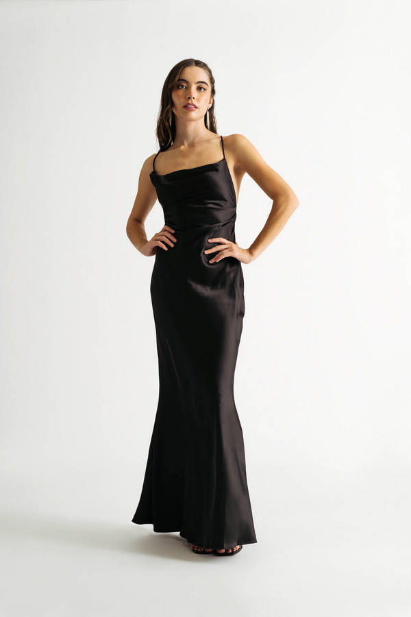 Make them stop and stare in this Ambitious Black Satin Cowl Neck Chain Maxi Slip Dress. In a luxurious satin fabric, this backless maxi dress features a cowl neckline with spaghetti straps that lead to an open back with a dainty chain detail. The perfect dress for any special occasion, you'll wow them all in this head-turning look.