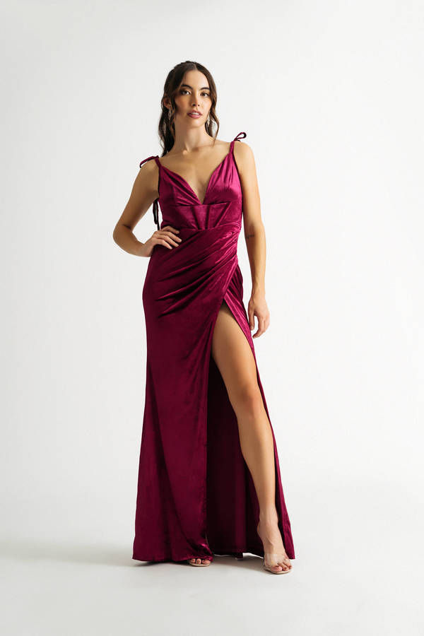 Make a lasting impression in the Remember Me Corset High Slit Maxi Dress in Wine! This stunning formal gown features a dramatic deep V-neckline and delicate spaghetti straps, designed to showcase your curves beautifully. The eye-catching slit adds a touch of drama, making it the perfect choice for your next special event. Slip into this luxurious velvet dress and get ready to turn heads—because unforgettable moments start with unforgettable outfits!