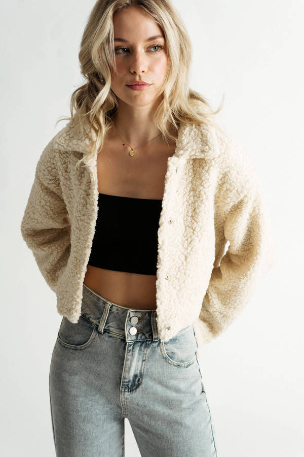 Stay cozy all winter long with our Warm Touch Beige Teddy Snap Button Crop Jacket. This jacket is perfect for those chillier days when you need something extra to keep you warm. With a fuzzy teddy lining, and in a stylish cropped length, this jacket is sure to become your go-to winter essential. With its snap button closure, this jacket is easy to put on and take off, so you can stay cozy without having to compromise on style.