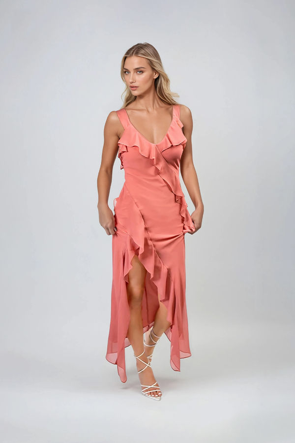Lover's Gaze V Neck Ruffle Maxi Dress - Rose