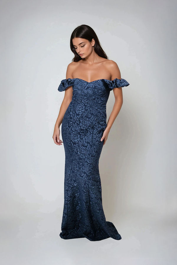 Turn every head in the Pretty As Ever Jacquard Floral Maxi Dress in Navy! This floral jacquard beauty features an off-shoulder sweetheart neckline and a figure-flattering mermaid silhouette that hugs in all the right places. Elegant, bold, and blooming with charm—it's your go-to for feeling fabulous at any formal affair!