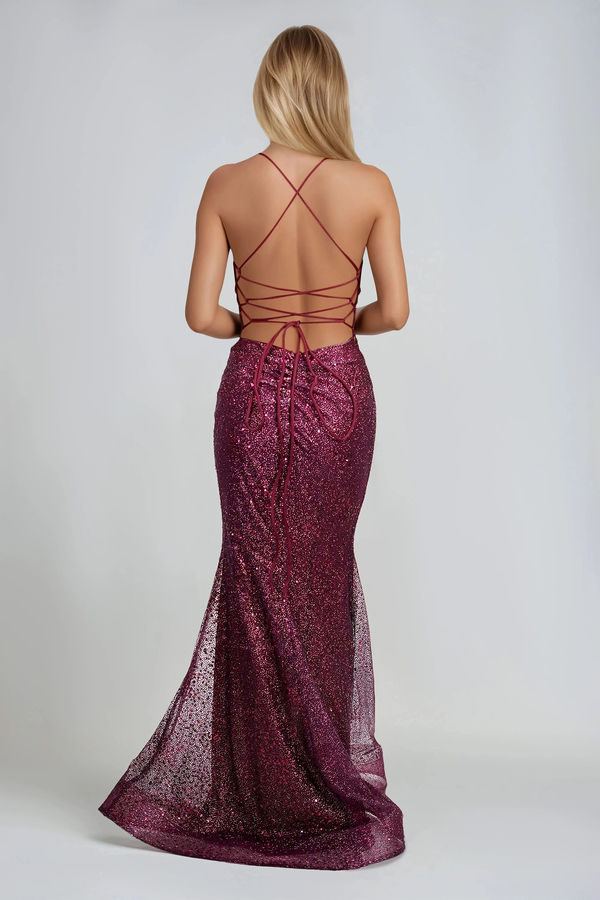 Starlight Kiss Glitter Mesh Mermaid Maxi Dress - Wine