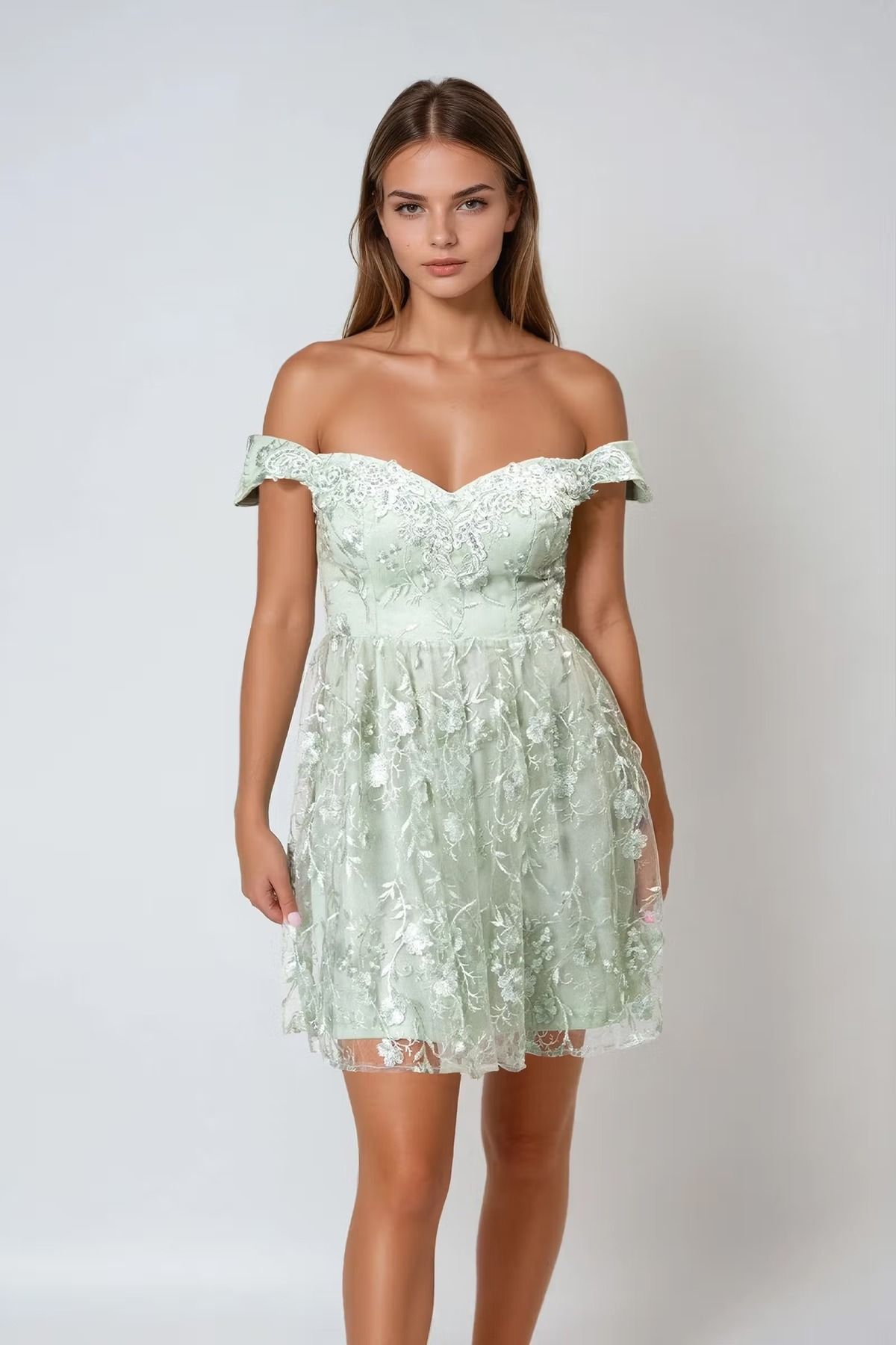 Lace Whisper Floral Off Shoulder Mini Dress - Dusty Sage