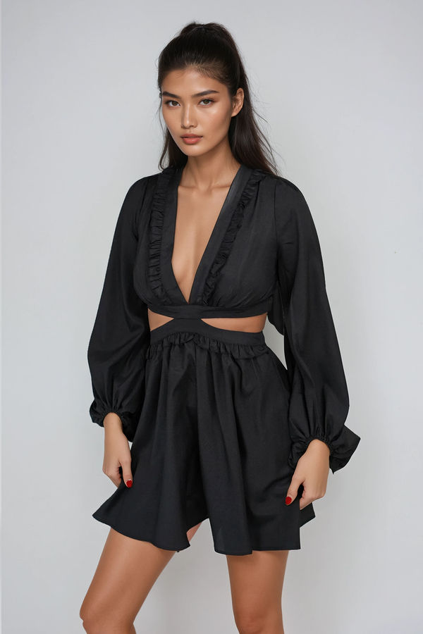 Shine under the night sky in the Moon Glow Deep V Cutout Mini Dress Black, perfect for evening soirees, rooftop cocktails, and special celebrations. Featuring a sultry deep V-neckline, long sleeves, flirty cutout waist, and delicate ruffle trim, this dress blends elegance with allure. Pair it with statement earrings and strappy heels for a look that captures attention from dusk to dawn.